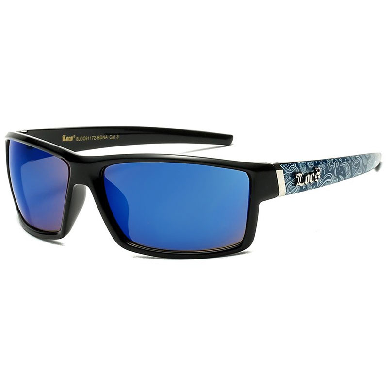 Sorte Locs solbriller med blå spejlglas, sølv metal logoer på stængerne og metal streger samt blåt bandana tryk